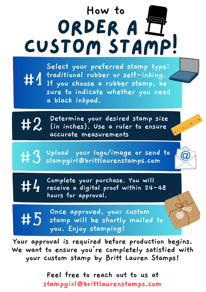 Order now to start stamping your way to stronger branding! Message me to discuss your custom design today if you have any additional questions.