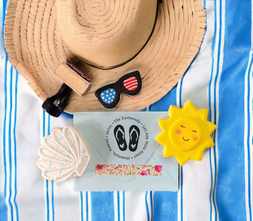 Put your stamp on it and showcase what you love! The perfect way to put your best foot forward! Our Flip Flop Address Stamp puts some sunshine into your mail. No need to keep your toes in the sand – when you have this stamp, you can bring the beach to you! Choose your desired finish - rubber or self-inking - for a crisp, professional look.