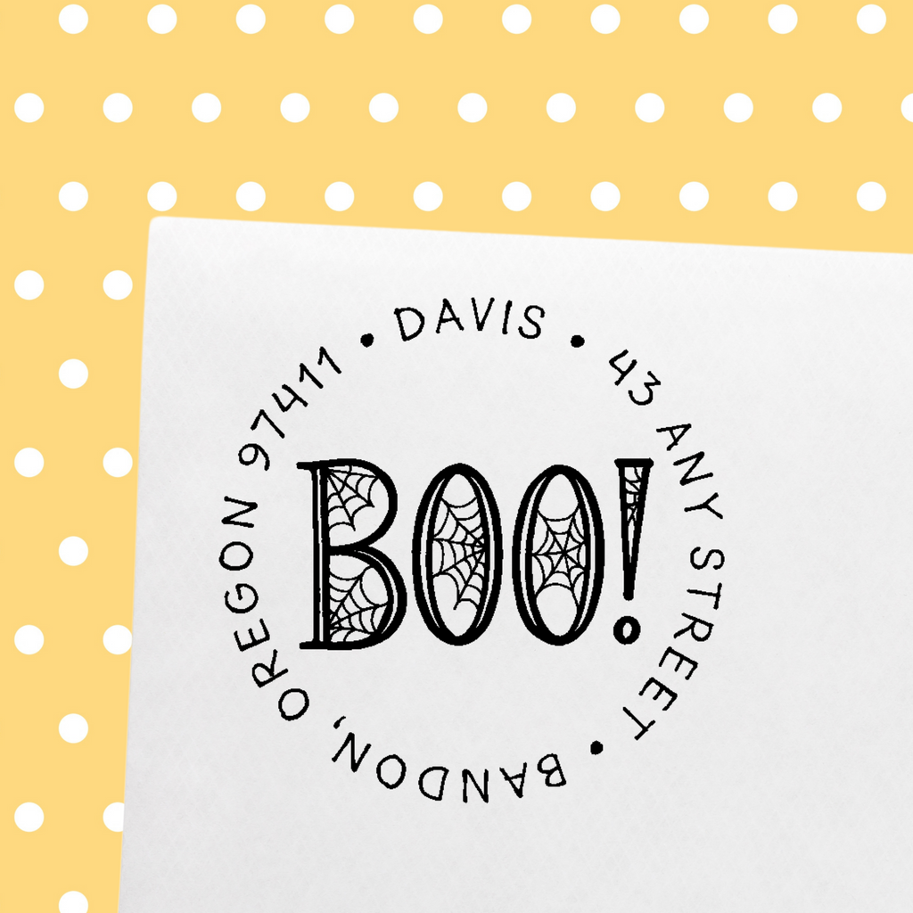 Add a spooky-cute touch to your Halloween mail with our BOO! Halloween Address Stamp! Featuring bold letters filled with playful spider webs, this personalized return address stamp is perfect for sending festive cards, party invites, or treats to friends and family. Available in rubber or self-inking styles for easy stamping all season long.